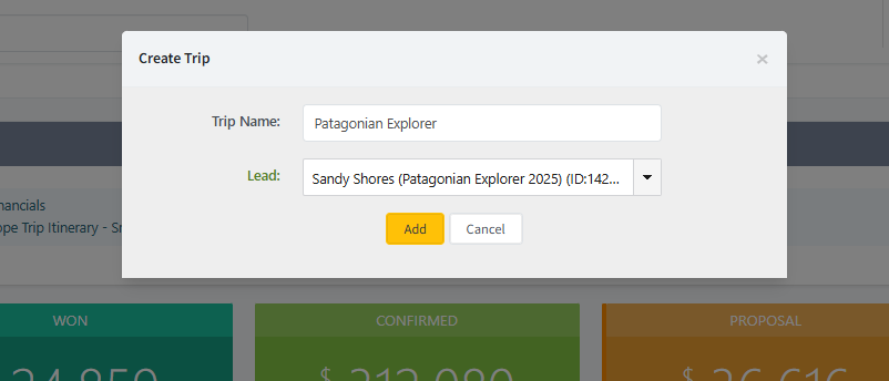 2. Enter a Trip Name and assign the Trip to a Lead Booking that should already exist. If not you'll need to create a new Lead Booking before creating a trip. Once complete, hit Add to continue.