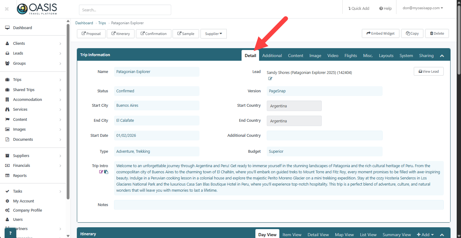 3. Here under the Trip Information section you'll see information to build out the trip under the Detail Tab. This will help capture meta data for trip search ability as well as drive other components of Oasis.