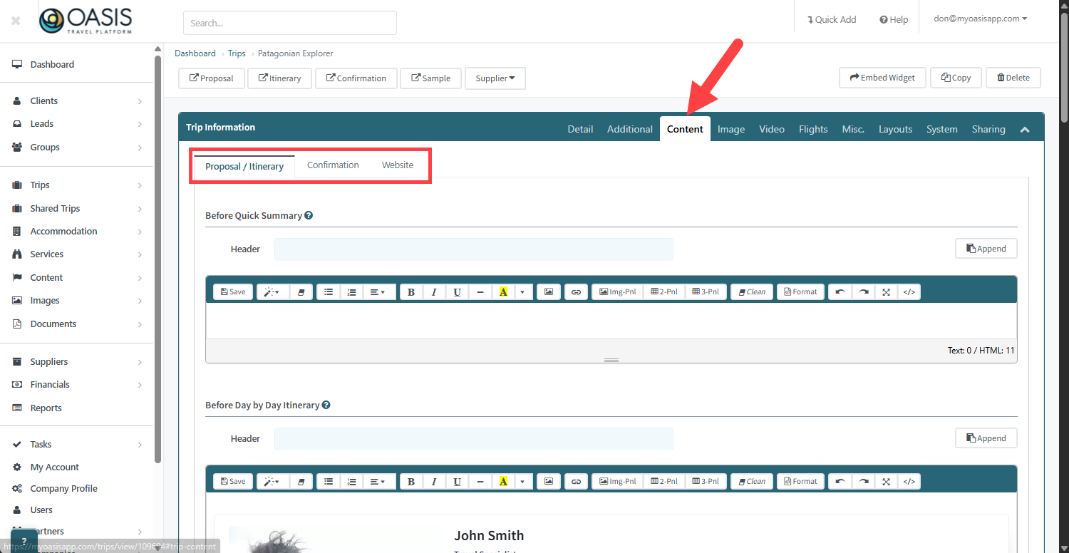 5. Under the Content tab is where custom content can be created. Each tab within the Content tab are for the different itineraries and all content editable using HTML content. Example is adding Agent Introductions.