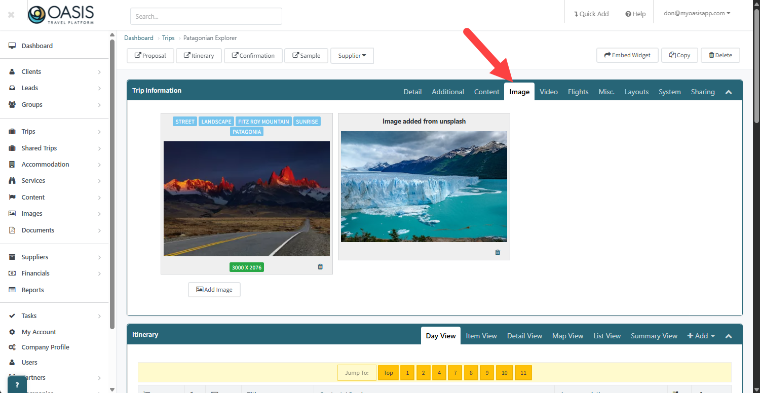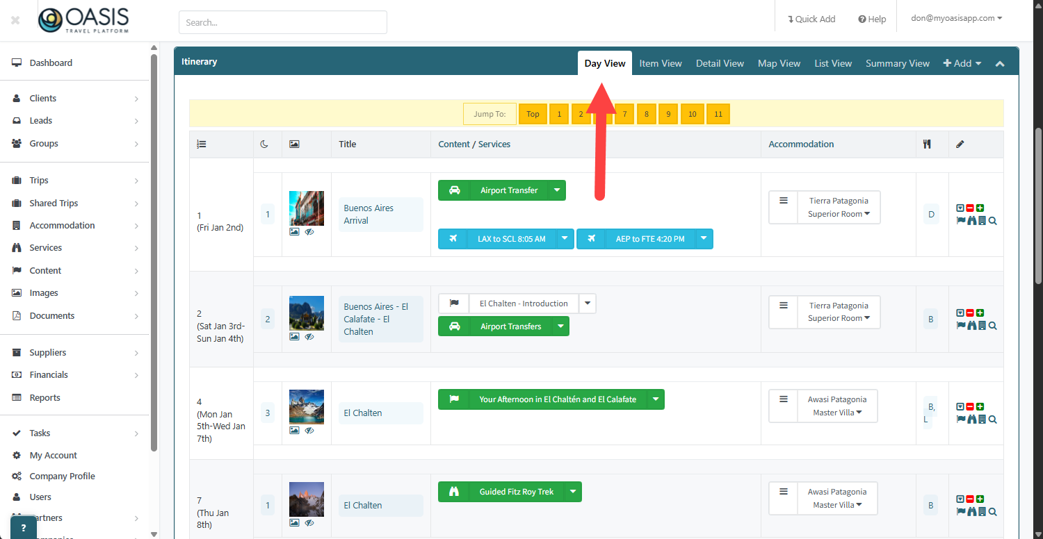 16. The Item View gives you the description on the itinerary allowing you to directly edit descriptions, Day Titles, and Names.