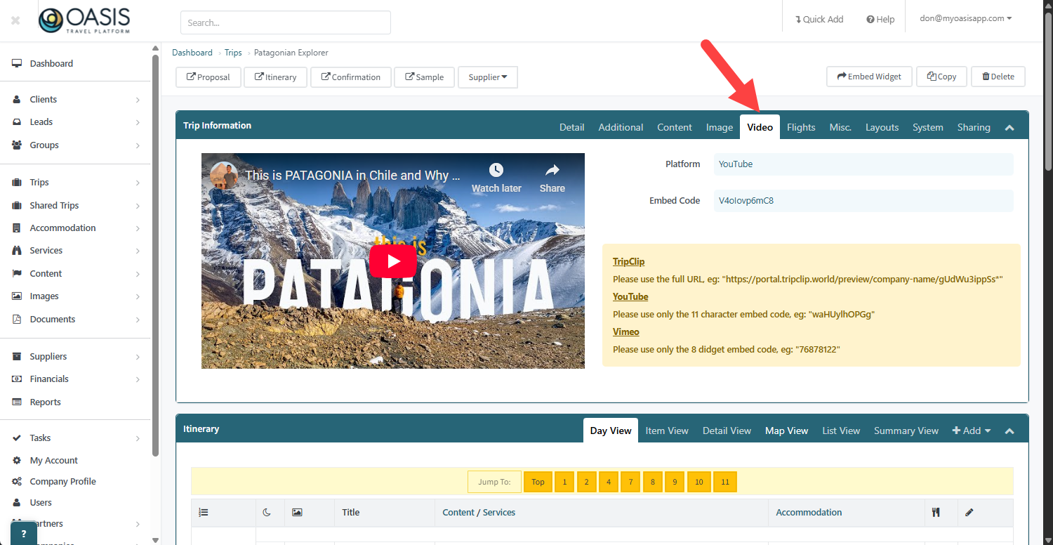 7. Under the Video tab is where you can add a hero video. Acceptable formats are from YouTube, Vimeo and TripClip. A handy link guide is in yellow.