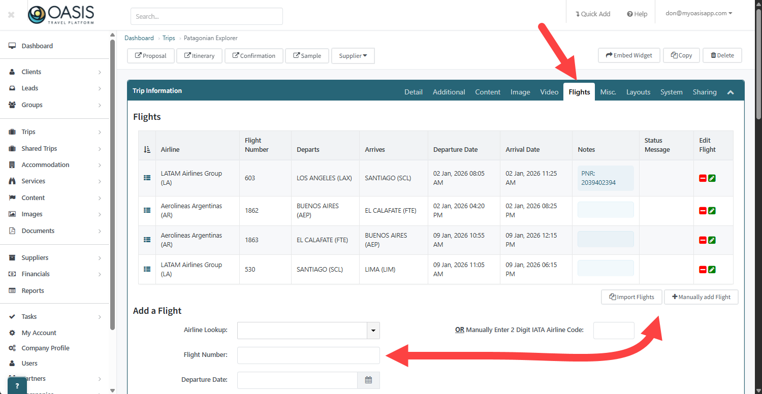 8. Under the Flights tab you can add a flight either by the airline, flight number or departure date, or, if the flight you are looking for is not found in our system, you can manually add the flight.