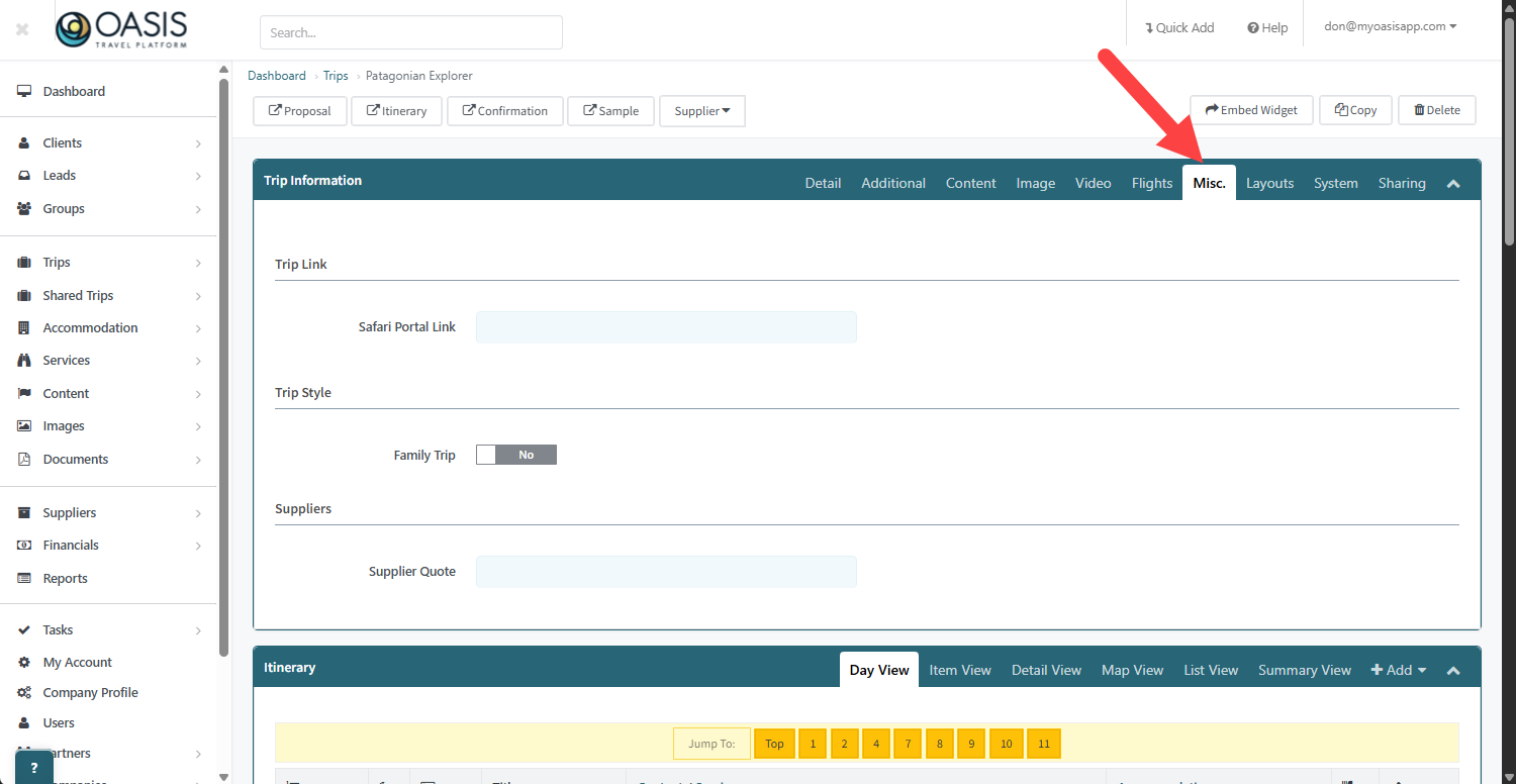 9. The Misc tab stores any Custom Fields created in your Company Profile under Custom Fields. This information is tied directly to your business setup and can be used to capture internal data, client specific details, or custom tracking fields that do not live elsewhere in the trip. (Learn how to create Custom Fields)