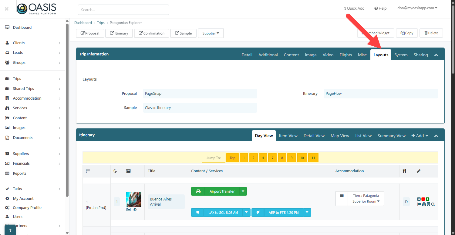 10. The Layouts tab allows you to choose how your Proposal, Itinerary, and Sample trips are displayed. You can select between Classic, PageSnap, or PageFlow layouts to control the visual structure and presentation style your clients see when viewing shared trips. (Learn more about Layout types)