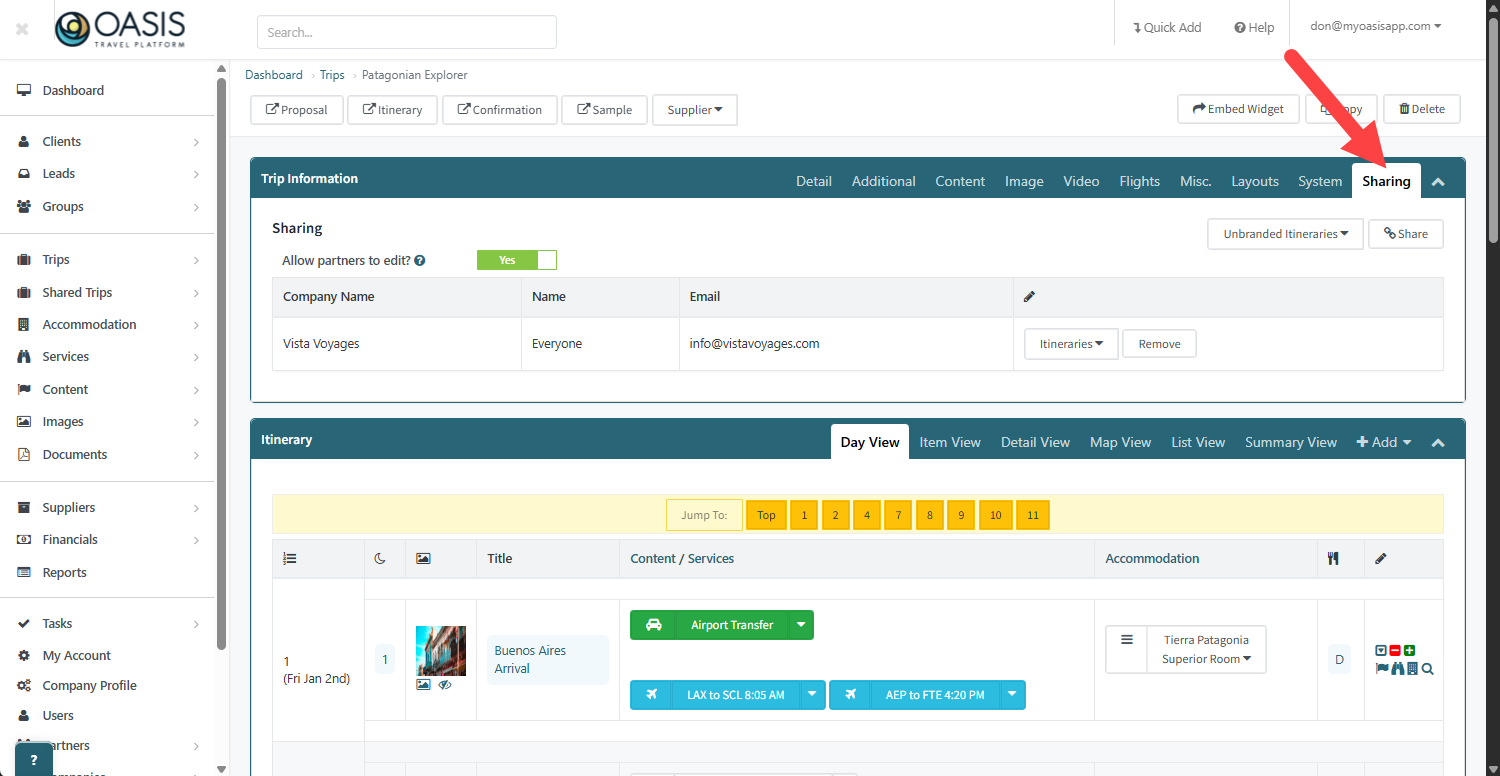 12. The Sharing tab you can see who the trip is shared with including the option to allow editing rights.