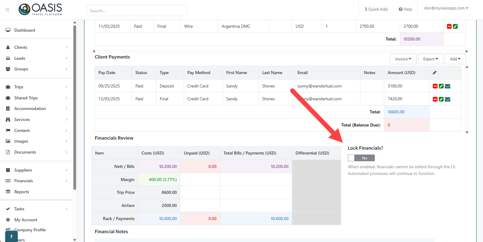 And that's how to Lock Financials for a Confirmed Trip on a Lead with the Oasis Travel Platform! We hope you found this guide helpful. If you need additional help or want to share your thoughts, reach out at support@myoasisapp.com. We love hearing from you and are always here to help.
