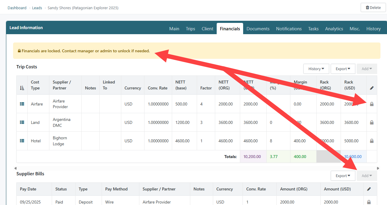 This applies anywhere financials are displayed, including the Lead Financials tab and the Trip Costs section on a Confirmed Trip. Since Trip financials are tied back to the Lead through a many to one relationship, locking financials on the Lead also locks them on the Confirmed Trip. Each cost type displays a lock icon, and a message appears above the financials indicating they are locked and must be unlocked by a manager or admin to make changes.