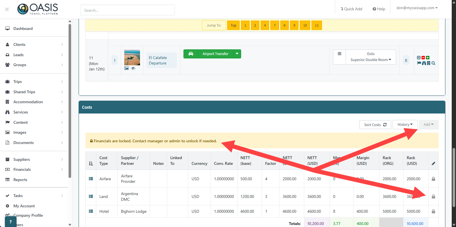 Any costs already added across Client Payments, Supplier Bills, or Trip Costs are fully locked and cannot be changed.