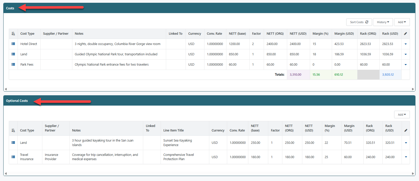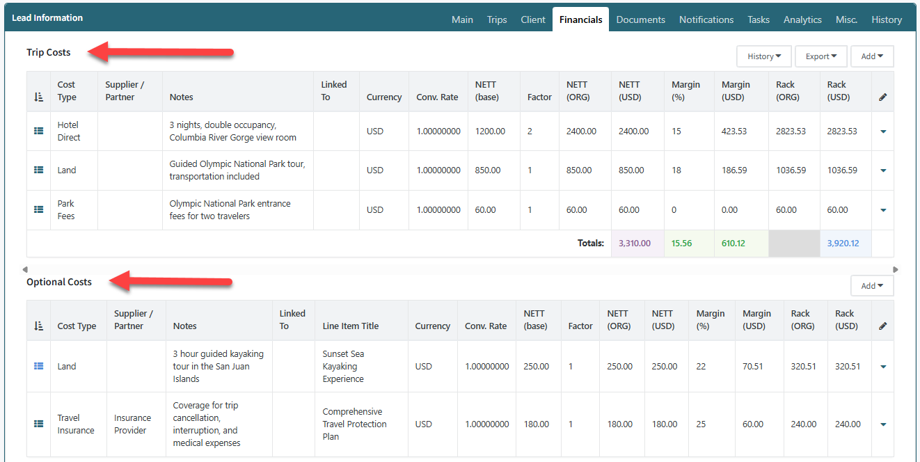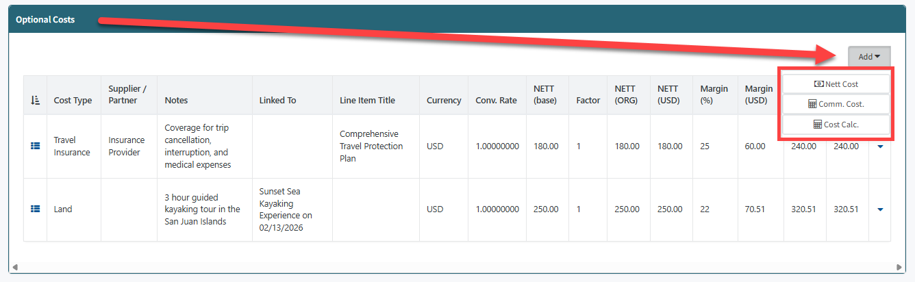 Optional Costs are available in both the Trip Builder and the Lead record.