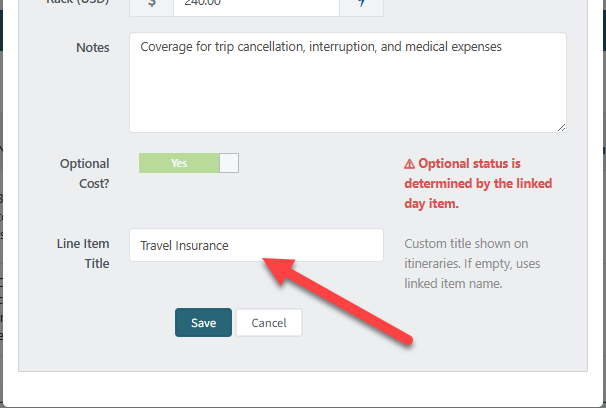 The Line Item Title field controls how an Optional Cost appears on the client-facing itinerary.