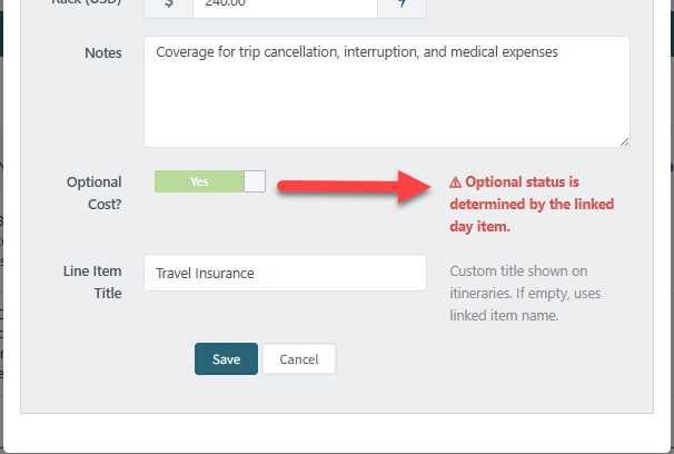 Optional Costs can be linked to a Day Item in the itinerary. When a cost is linked, the Optional setting is controlled by the Day Item, not by the toggle inside the cost.