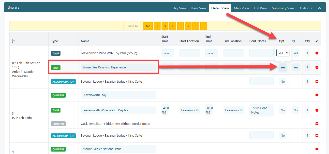 To update the status, go to the itinerary Detail View and locate the Optional column. If the item is set to Yes, the cost remains in the Optional Costs section. If changed to No, the system will automatically move the cost into the Trip Costs section and include it in financial calculations.